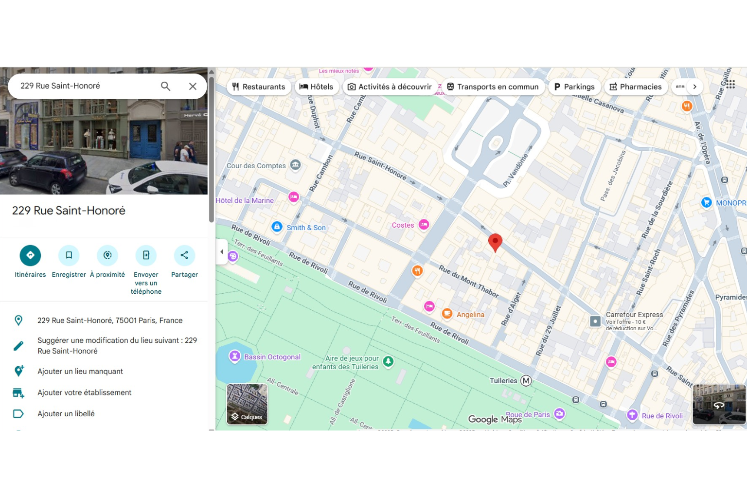 • Adresse postale : 229 rue Saint-Honoré, 75001 Paris